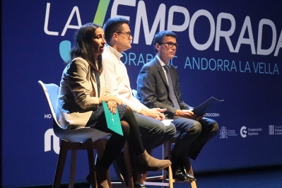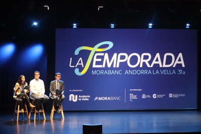 La cònsol menor d’Andorra la Vella, Olalla Losada, el codirector de la Temporada MoraBanc Andorra la Vella, Jordi Sabata, i el director de màrqueting i comunicació de MoraBanc, Wiro Martin, durant la presentació de la 31a Temporada.