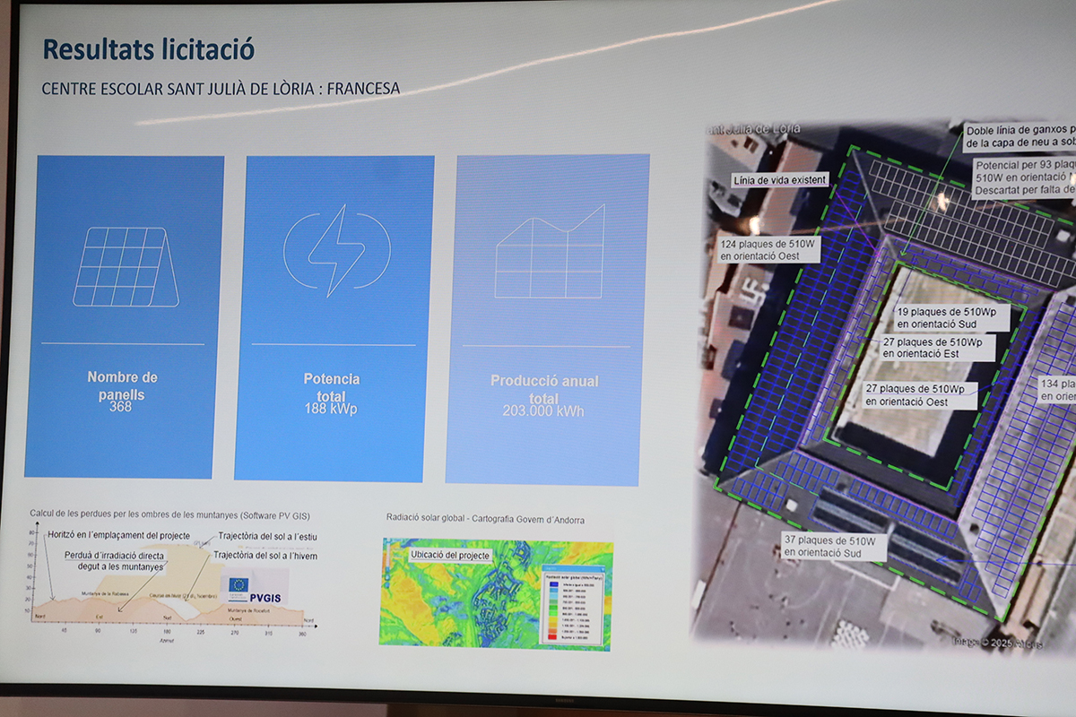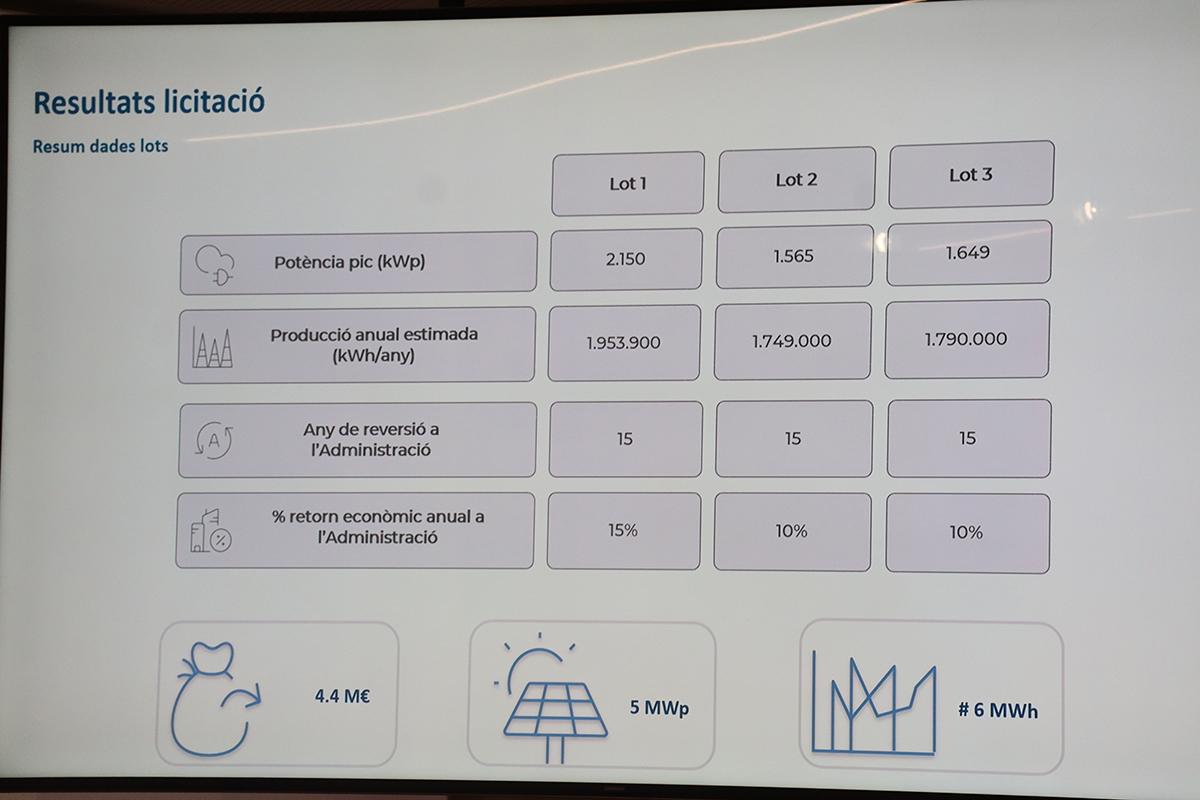 Un total de 4'4 milions d'euros. Aquest serà el cost de l'inversió que el privat haurà de fer en el projecte d’instal·lació de plaques solars als edificis administratius. Així ho ha anunciat en roda de premsa el director d'energia i transports, Carles Miquel, on s'han adjudicat la concessió i instal·lació d'aquests elements. En aquest sentit, la concessió que es va treure fa uns mesos contemplava la instal·lació, gestió i manteniment dels sistemes de producció d'energia elèctrica en cobertes i altres espais de la pròpia administració.