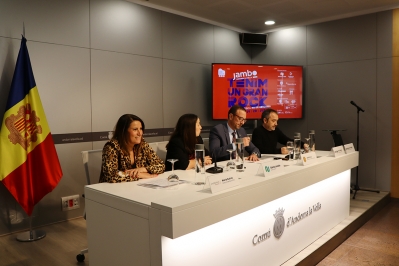 La directora de banca país d'Andbank, Maria Suárez, la cònsol menor d'Andorra la Vella, Olalla Losada, el ministre de Turisme i Comerç, Jordi Torres, i un dels organtizadors del festival, Toni Colom, durant la presentació del Jambo.