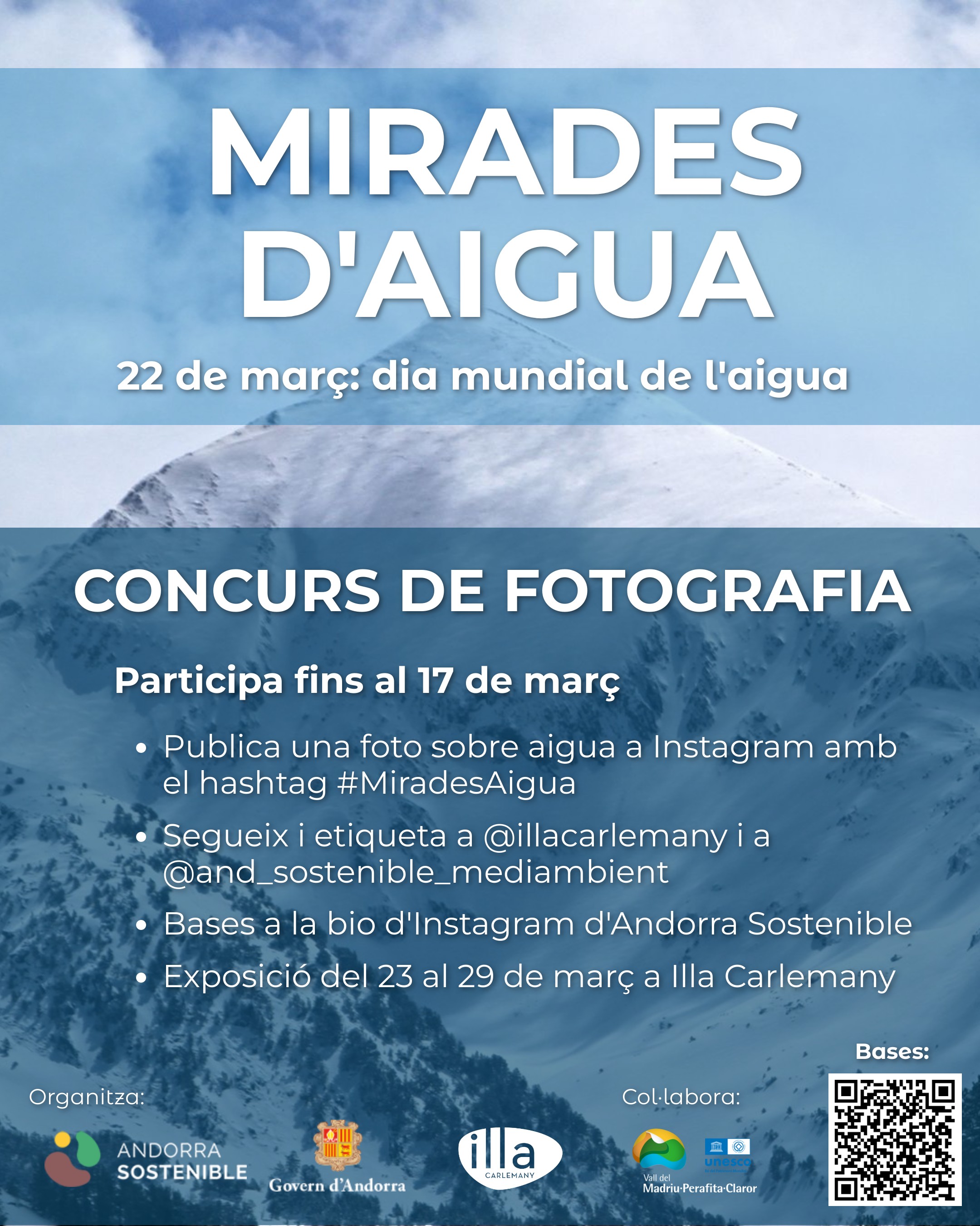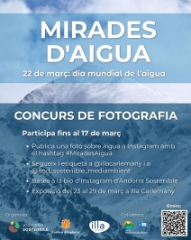 Andorra Sostenible posa en marxa el concurs de fotografia 'Mirades d'aigua – Andorra 2026' amb motiu del Dia mundial de l'Aigua, amb l'objectiu de sensibilitzar la ciutadania sobre el valor ambiental, social i territorial d'aquest recurs essencial al nostre país. La iniciativa està organitzada conjuntament amb Illa Carlemany i compta amb la col·laboració de la Vall del Madriu-Perafita-Claror.