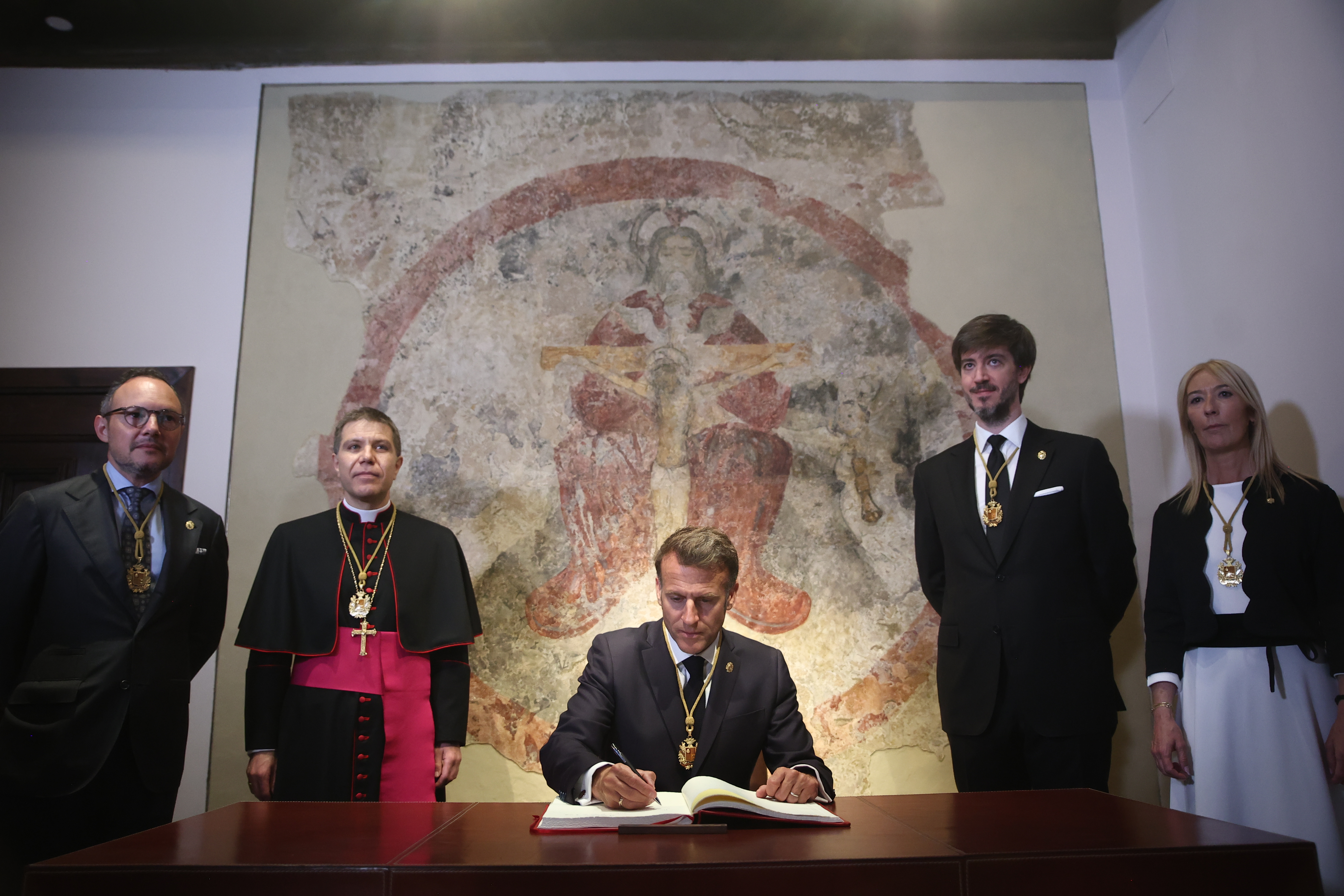 Moment de la signatura dels coprínceps, Emmanuel Macron i Josep Lluís Serrano i Pentinat, del Llibre d'Or a la Casa de la Vall, amb el cap de Govern, Xavier Espot, i el síndic general, Carles Ensenyat, i la subsíndica, Sandra Codina.