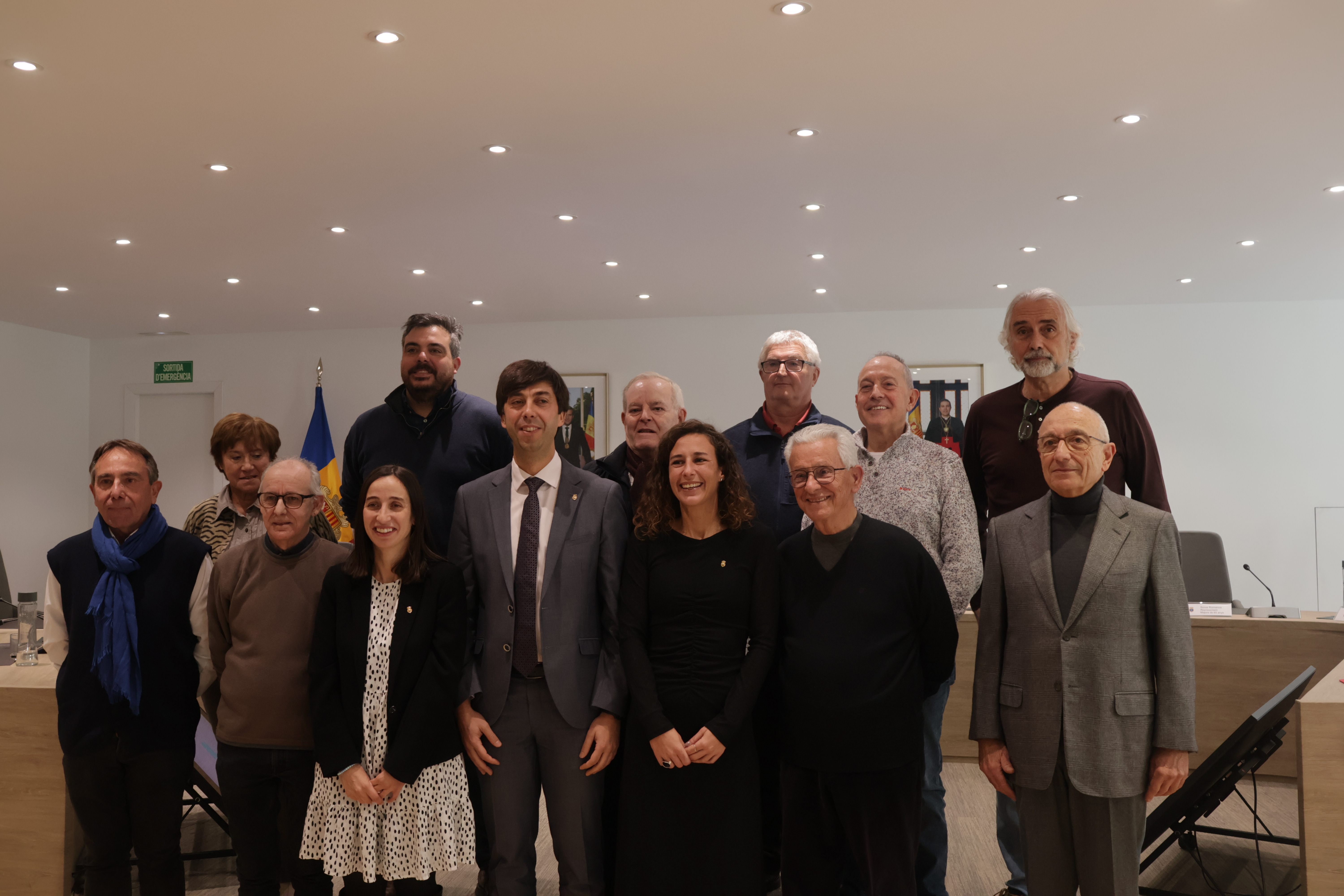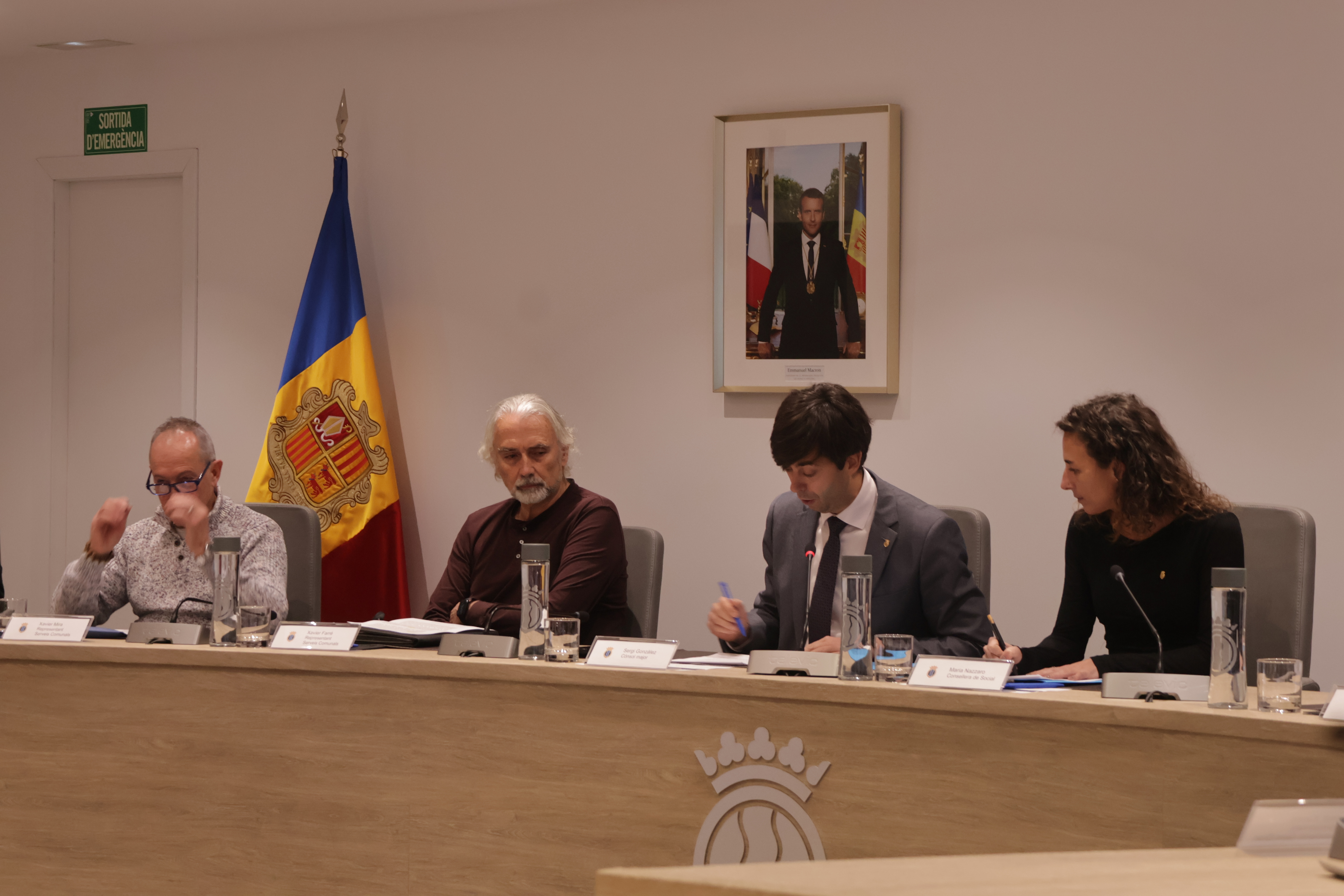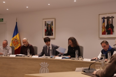 El cònsol major, Sergi González, la consellera de Social, Joventut i Espai Ciutadà d'Andorra la Vella, Maria Nazzaro, i els consellers de la Gent Gran durant el plenari.