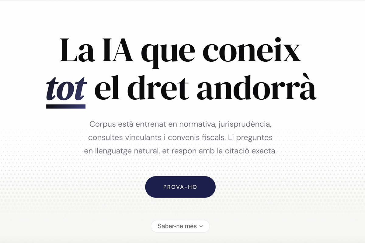 Dos residents al Principat, un advocat i un informàtic, s’han unit per crear Corpus (corpus.ad), la primera eina d’intel·ligència artificial entrenada exclusivament amb tot el dret andorrà: normativa, jurisprudència, consultes vinculants i convenis fiscals.