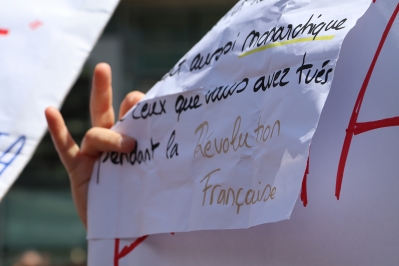 Una dona sosté una pancarta durant la protesta a la plaça del Poble.